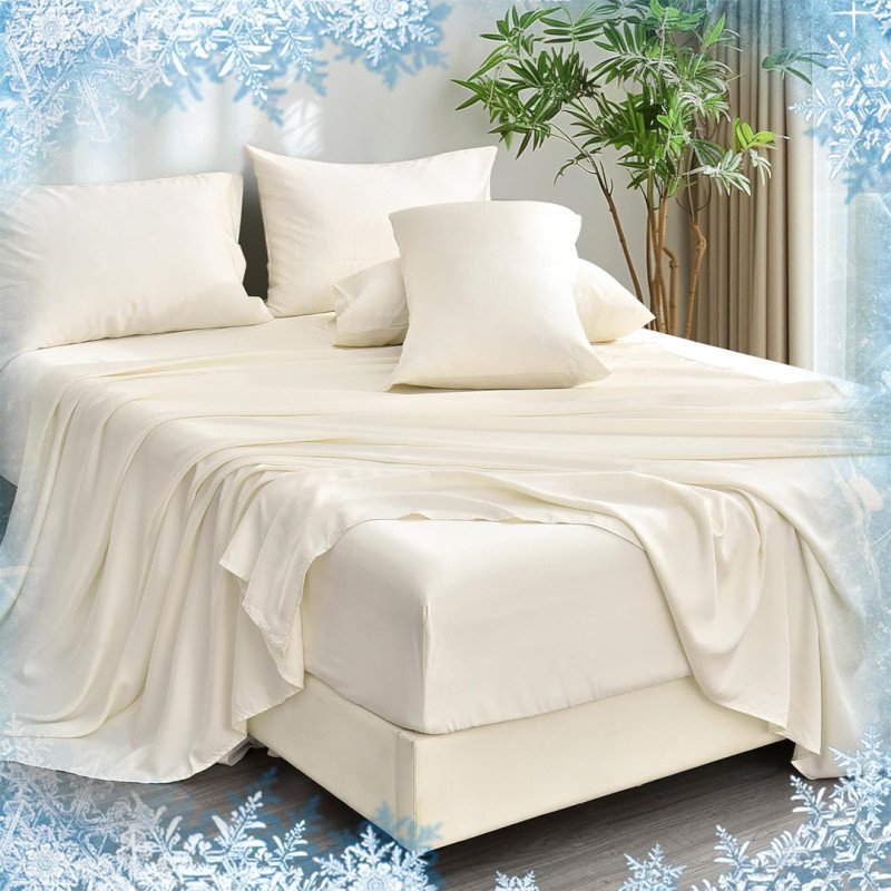 The six-piece set includes a fitted sheet with deep pockets and reinforced elastic, a flat sheet, and four pillowcases. All the bedding is made from 100% rayon derived from natural bamboo, allowing these sheets to regulate temperature throughout the night. Along with staying consistently cool, the breathable fabric actively wicks away moisture, so those who sweat at night will stay comfortable and dry.