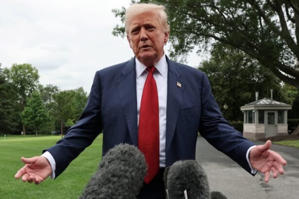 U.S. President Donald Trump speaks to reporters ahed of boarding Marine One to depart for New Jersey, at the White House in Washington, D.C., U.S., August 1, 2025. Jonathan Ernst…