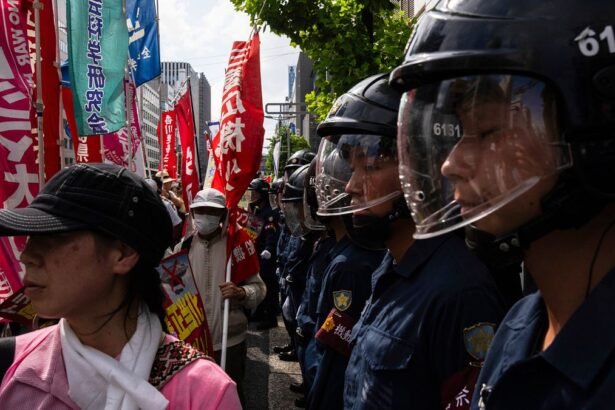 The protestors called for the abolition of nuclear weapons and an end to war, holding signs and chanting while official commemorations took place across the Peace Memorial Park. Police urged…