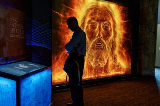 On the second floor of a cultural center at Christ Cathedral in Orange County, an AI-rendered depiction of Jesus, calm and smiling, fills one side of the room. Breaking a…