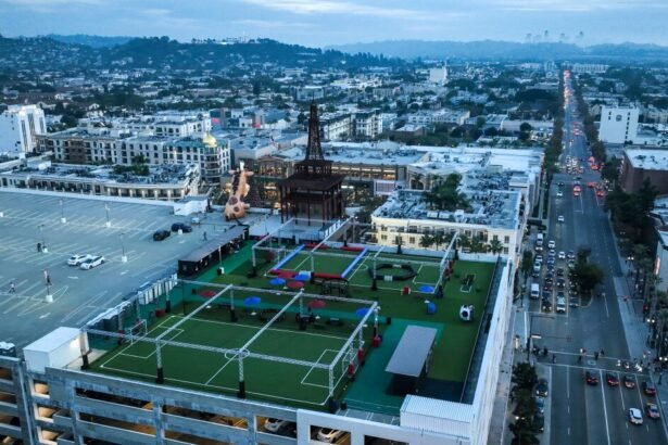 As the sun begins to set over the San Gabriel Mountains, a group of people runs across a vibrant turf soccer field, passing a ball through the air. Theyâre surrounded…