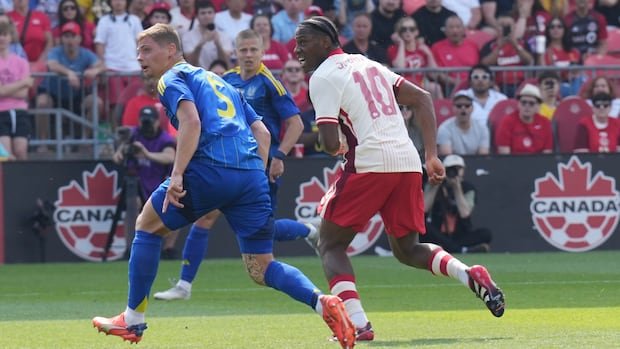 Jonathan David scored the first two goals en route to a 4-2 Canadian win over Ukraine at the Canadian Shield tournament from BMO Field.
