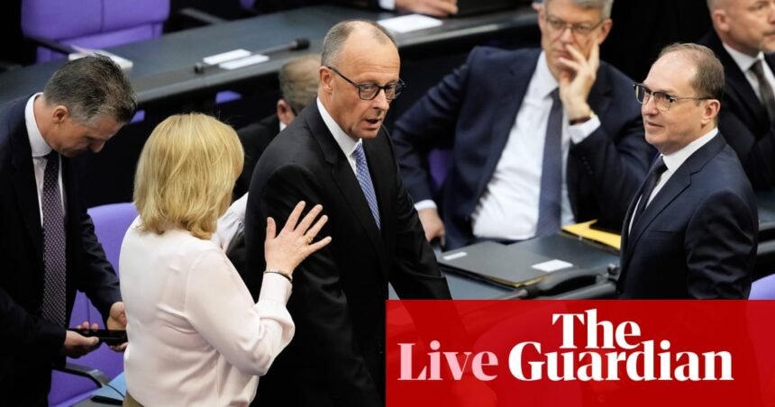 “,”elementId”:”8f696ad1-a45c-4e8e-a5f6-769780359cfc”}],”attributes”:{“pinned”:false,”keyEvent”:true,”summary”:false},”blockCreatedOn”:1746518893000,”blockCreatedOnDisplay”:”09.08 BST”,”blockLastUpdated”:1746518999000,”blockLastUpdatedDisplay”:”09.09 BST”,”blockFirstPublished”:1746518999000,”blockFirstPublishedDisplay”:”09.09 BST”,”blockFirstPublishedDisplayNoTimezone”:”09.09″,”title”:”Merz fails to secure majority to get elected chancellor”,”contributors”:[],”primaryDateLine”:”Tue 6 May 2025 10.05 BST”,”secondaryDateLine”:”First published on Tue 6 May 2025 07.58 BST”},{“id”:”6819c25d8f088a65239d2a10″,”elements”:[{“displayCredit”:true,”_type”:”model.dotcomrendering.pageElements.ImageBlockElement”,”role”:”inline”,”media”:{“allImages”:[{“index”:0,”fields”:{“height”:”3388″,”width”:”5236″},”mediaType”:”Image”,”mimeType”:”image/jpeg”,”url”:”https://media.guim.co.uk/fed98036141da9ff3fa15f231976599e59b8d897/0_0_5236_3388/5236.jpg”},{“index”:1,”fields”:{“isMaster”:”true”,”height”:”3388″,”width”:”5236″},”mediaType”:”Image”,”mimeType”:”image/jpeg”,”url”:”https://media.guim.co.uk/fed98036141da9ff3fa15f231976599e59b8d897/0_0_5236_3388/master/5236.jpg”},{“index”:2,”fields”:{“height”:”1294″,”width”:”2000″},”mediaType”:”Image”,”mimeType”:”image/jpeg”,”url”:”https://media.guim.co.uk/fed98036141da9ff3fa15f231976599e59b8d897/0_0_5236_3388/2000.jpg”},{“index”:3,”fields”:{“height”:”647″,”width”:”1000″},”mediaType”:”Image”,”mimeType”:”image/jpeg”,”url”:”https://media.guim.co.uk/fed98036141da9ff3fa15f231976599e59b8d897/0_0_5236_3388/1000.jpg”},{“index”:4,”fields”:{“height”:”324″,”width”:”500″},”mediaType”:”Image”,”mimeType”:”image/jpeg”,”url”:”https://media.guim.co.uk/fed98036141da9ff3fa15f231976599e59b8d897/0_0_5236_3388/500.jpg”},{“index”:5,”fields”:{“height”:”91″,”width”:”140″},”mediaType”:”Image”,”mimeType”:”image/jpeg”,”url”:”https://media.guim.co.uk/fed98036141da9ff3fa15f231976599e59b8d897/0_0_5236_3388/140.jpg”}]},”elementId”:”129e2f8b-05f7-4946-bb5f-d7ee243eca3a”,”imageSources”:[{“weighting”:”inline”,”srcSet”:[{“src”:”https://i.guim.co.uk/img/media/fed98036141da9ff3fa15f231976599e59b8d897/0_0_5236_3388/master/5236.jpg?width=620&quality=85&auto=format&fit=max&s=4481ec9bb9b10678b8a82628019b3261″,”width”:620},{“src”:”https://i.guim.co.uk/img/media/fed98036141da9ff3fa15f231976599e59b8d897/0_0_5236_3388/master/5236.jpg?width=620&quality=45&auto=format&fit=max&dpr=2&s=2f18312d95149a02fafdee45c12c8187″,”width”:1240},{“src”:”https://i.guim.co.uk/img/media/fed98036141da9ff3fa15f231976599e59b8d897/0_0_5236_3388/master/5236.jpg?width=605&quality=85&auto=format&fit=max&s=d075f926a3a42efd62965aa13ea2add7″,”width”:605},{“src”:”https://i.guim.co.uk/img/media/fed98036141da9ff3fa15f231976599e59b8d897/0_0_5236_3388/master/5236.jpg?width=605&quality=45&auto=format&fit=max&dpr=2&s=2fc035311dc1850f01816ee0aa14ec01″,”width”:1210},{“src”:”https://i.guim.co.uk/img/media/fed98036141da9ff3fa15f231976599e59b8d897/0_0_5236_3388/master/5236.jpg?width=445&quality=85&auto=format&fit=max&s=da7139732d6aa8f38f3063b0c29f41fa”,”width”:445},{“src”:”https://i.guim.co.uk/img/media/fed98036141da9ff3fa15f231976599e59b8d897/0_0_5236_3388/master/5236.jpg?width=445&quality=45&auto=format&fit=max&dpr=2&s=05bd481436aa506dd870eecf5c5e4c05″,”width”:890}]},{“weighting”:”thumbnail”,”srcSet”:[{“src”:”https://i.guim.co.uk/img/media/fed98036141da9ff3fa15f231976599e59b8d897/0_0_5236_3388/master/5236.jpg?width=140&quality=85&auto=format&fit=max&s=8aa2797250b2a3851655b777f5c9d515″,”width”:140},{“src”:”https://i.guim.co.uk/img/media/fed98036141da9ff3fa15f231976599e59b8d897/0_0_5236_3388/master/5236.jpg?width=140&quality=45&auto=format&fit=max&dpr=2&s=123874f5f390a3790aad0993ae94204a”,”width”:280},{“src”:”https://i.guim.co.uk/img/media/fed98036141da9ff3fa15f231976599e59b8d897/0_0_5236_3388/master/5236.jpg?width=120&quality=85&auto=format&fit=max&s=4de4106b41f89977356bd23b264a39bb”,”width”:120},{“src”:”https://i.guim.co.uk/img/media/fed98036141da9ff3fa15f231976599e59b8d897/0_0_5236_3388/master/5236.jpg?width=120&quality=45&auto=format&fit=max&dpr=2&s=167a0ea5e9fbad33a3ca0e60e1af1c9a”,”width”:240}]},{“weighting”:”supporting”,”srcSet”:[{“src”:”https://i.guim.co.uk/img/media/fed98036141da9ff3fa15f231976599e59b8d897/0_0_5236_3388/master/5236.jpg?width=380&quality=85&auto=format&fit=max&s=5bc64a69c7ee1e63f4443e9a9c66b032″,”width”:380},{“src”:”https://i.guim.co.uk/img/media/fed98036141da9ff3fa15f231976599e59b8d897/0_0_5236_3388/master/5236.jpg?width=380&quality=45&auto=format&fit=max&dpr=2&s=33e3275f83996113309a9e66a4060c20″,”width”:760},{“src”:”https://i.guim.co.uk/img/media/fed98036141da9ff3fa15f231976599e59b8d897/0_0_5236_3388/master/5236.jpg?width=300&quality=85&auto=format&fit=max&s=caf349678e373064bda0470e610835c7″,”width”:300},{“src”:”https://i.guim.co.uk/img/media/fed98036141da9ff3fa15f231976599e59b8d897/0_0_5236_3388/master/5236.jpg?width=300&quality=45&auto=format&fit=max&dpr=2&s=b2ead4f2028a38ea32da83e8b2046b22″,”width”:600},{“src”:”https://i.guim.co.uk/img/media/fed98036141da9ff3fa15f231976599e59b8d897/0_0_5236_3388/master/5236.jpg?width=620&quality=85&auto=format&fit=max&s=4481ec9bb9b10678b8a82628019b3261″,”width”:620},{“src”:”https://i.guim.co.uk/img/media/fed98036141da9ff3fa15f231976599e59b8d897/0_0_5236_3388/master/5236.jpg?width=620&quality=45&auto=format&fit=max&dpr=2&s=2f18312d95149a02fafdee4