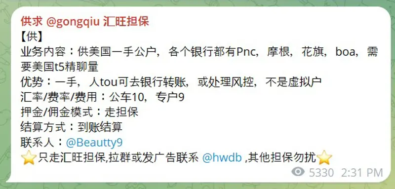 • Black Market Bank Accounts: Chinese-language Telegram channels offer to rent U.S. bank accounts to pig-butchering scammers, who use the accounts to move victims’ cash into crypto.