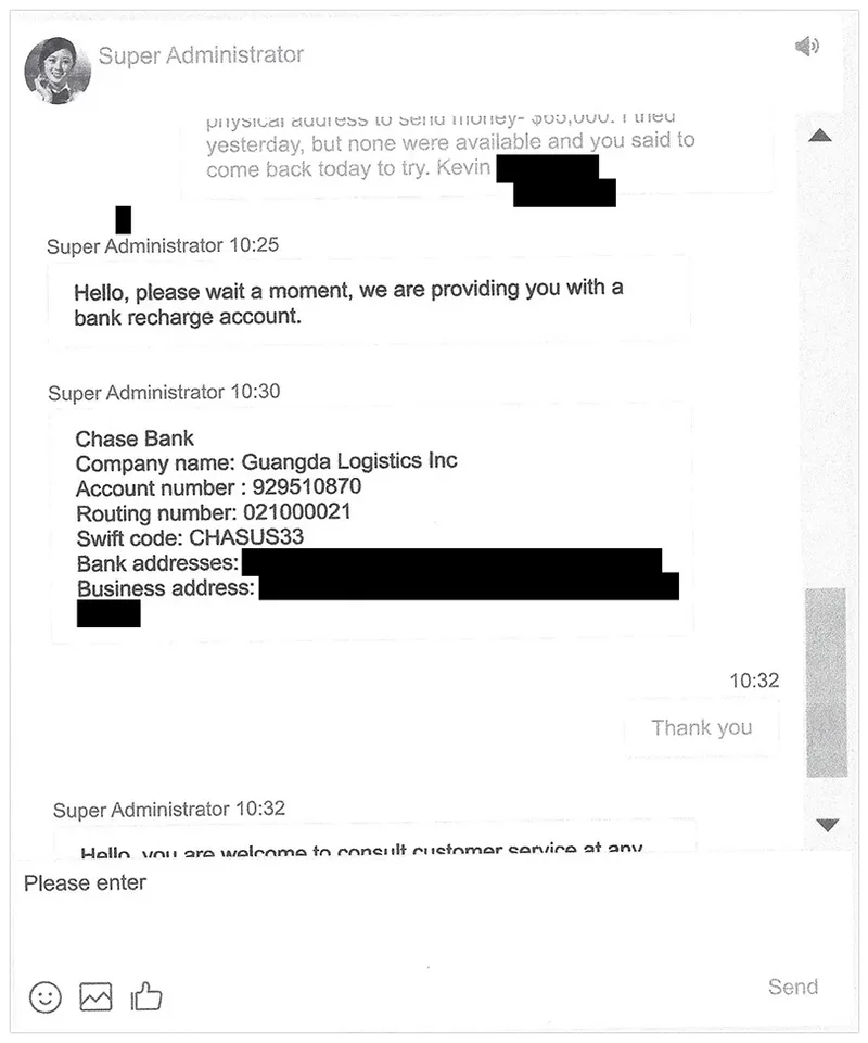 An excerpt from Kevin’s chat log with the purported 3A trading site shows how the scammers, claiming to be customer service reps, directed him to wire funds to companies other than 3A with accounts at Chase.