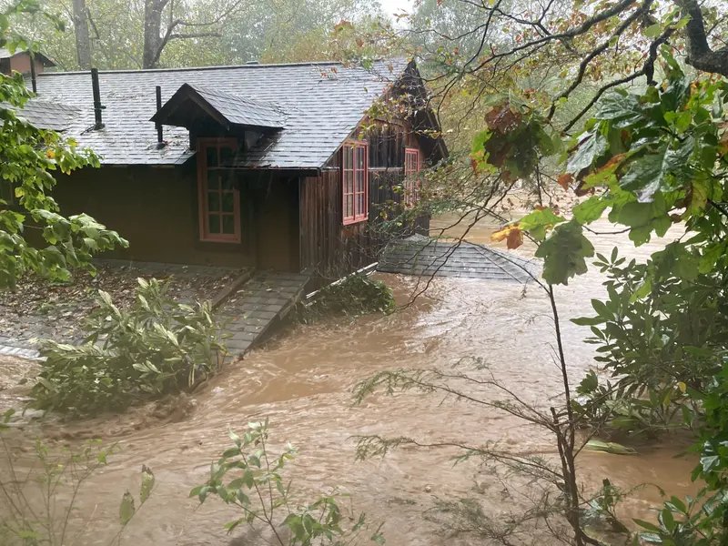 After John falls asleep in his hotel, Helene makes landfall on the Florida panhandle about 500 miles south of the Black Mountains. As its massive bands close in, Janicke stays up listening to the storm and texting a tenant who rents one of their cottages, about 40 yards away right on the creek.