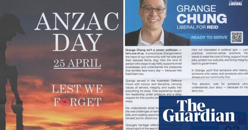 The Anzac Day booklet, authorised by the NSW Liberal party, contained images of Chung, a former navy officer, dressed in military uniform. The defence department has repeatedly urged veterans to refrain from using pictures of themselves in uniform, to avoid any suggestion the military is politically partisan.