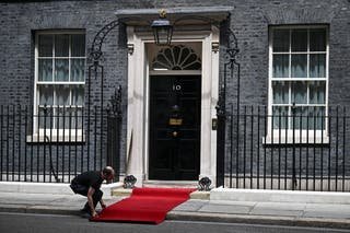 A red carpet was rolled out in front of No 10 as the prime minister prepares to host the French president for lunch.