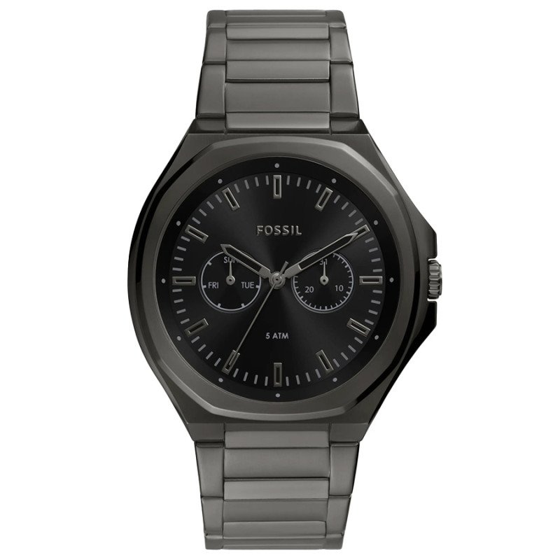 This Fossil watch has a 45-millimeter case that holds a main time dial and two smaller dials: one for the days of the week and one for the days of the month. The Quartz movement in the watch promises the most accurate timekeeping, so you’re never late for dinner again. The band and case are made from stainless steel that always catches the eye. Whether you get it all black or with the other two color combos, the design of the watch is sure to be noticed anywhere you go.