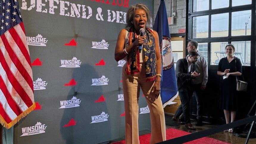 HOPEWELL, Va. — Against an olive drab backdrop in a barbecue joint filled with the aroma of pulled pork and the sweat of a Virginia summer, Republican Winsome Earle-Sears told voters she was running her campaign for governor like a military-style operation.