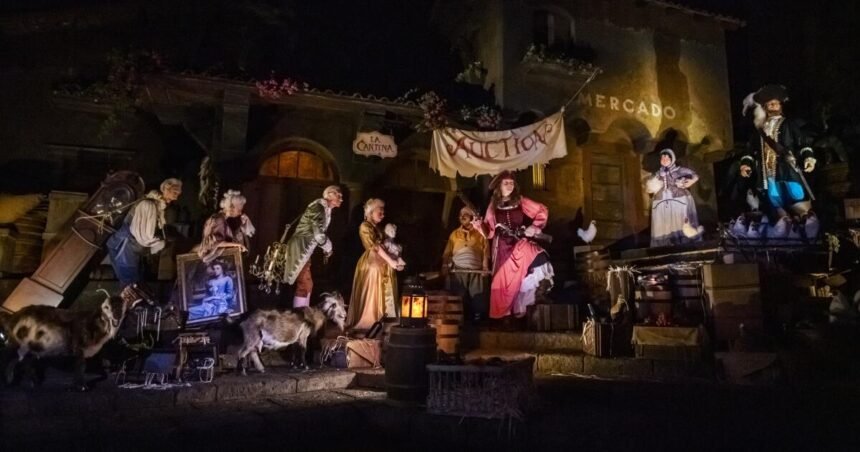 Indeed, Atencio’s words — some of those quoted in the book, such as “Avast there! Ye come seeking adventure and salty old pirates, aye?” — have become shorthand for how to speak like a pirate. The first scene written for the attraction was the mid-point auction sequence, a section of the ride that was changed in 2017 due to its outdated cultural implications. In the original, a proud redheaded pirate is the lead prisoner in a bridal auction, but today the “wench” has graduated to pirate status of her own and is helping to auction off stolen goods.