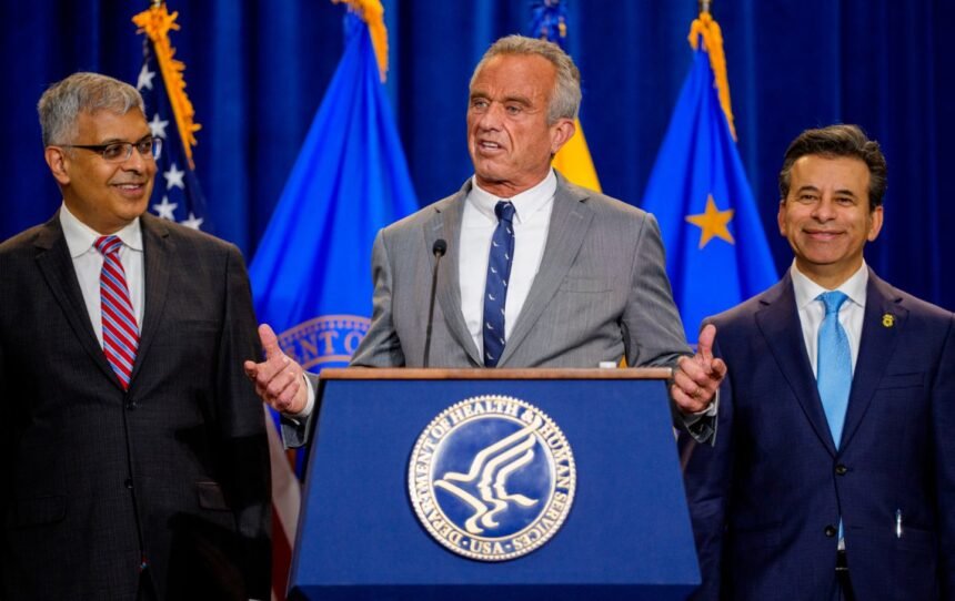 Health and Human Services Secretary Robert F. Kennedy Jr., accompanied by National Institutes of Health Director Jayanta Bhattacharya (L), and Food and Drug Administration Commissioner Marty Makary (R), speaks during a news conference at the Health and Human Services Department on April 22, 2025, in Washington, DC.
