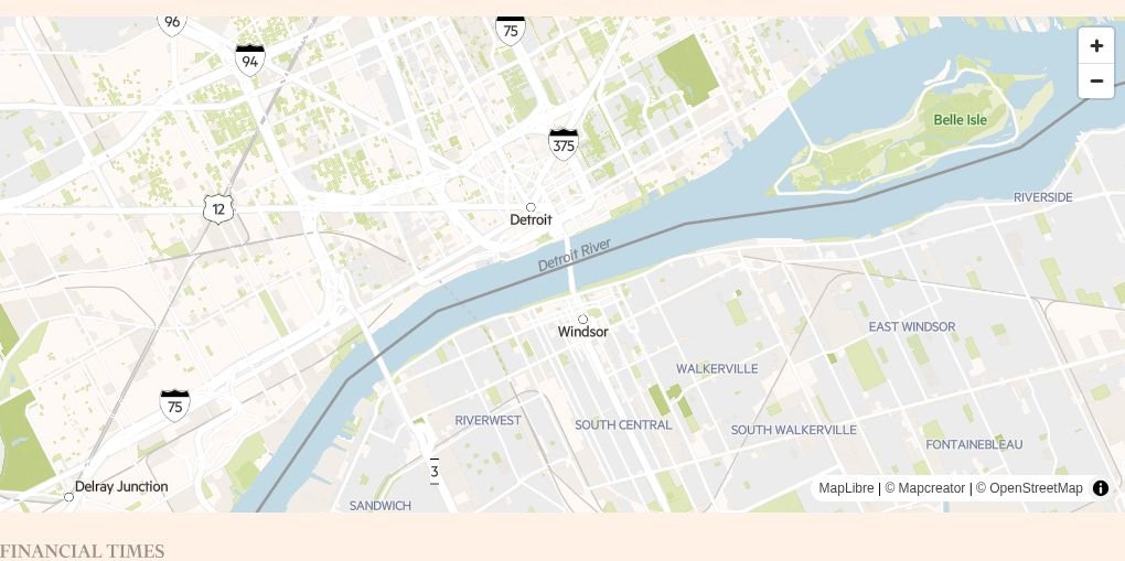 The crossing is one of the busiest in North America, with about $400mn in freight moving across the bridge daily. Nearby, more than 3.9mn vehicles moved through the Detroit Windsor Tunnel last year — some people commuting to work, others headed to concerts, sporting events or a favourite restaurant.