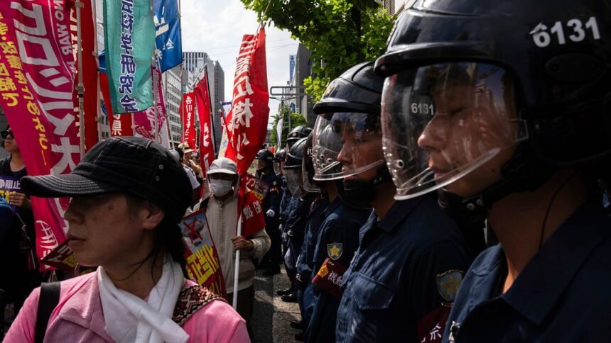 The protestors called for the abolition of nuclear weapons and an end to war, holding signs and chanting while official commemorations took place across the Peace Memorial Park. Police urged the group to disperse, but many remained in place.