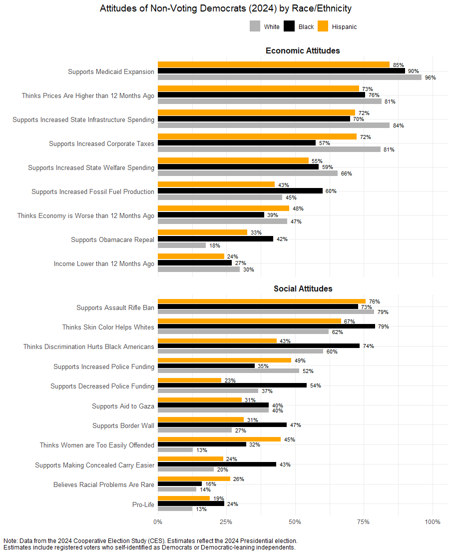 These divides shouldn’t be overstated. But, at the very least, we can say that there is little evidence that nonvoting Black or Latino Democrats are consistently more socially liberal than nonvoting white Democrats. Further, these figures suggest that any attempt to mobilize nonvoting Democrats must grapple with the ideological heterogeneity within their base. Messaging and outreach efforts that fail to navigate these tensions will struggle to bring the party’s most disengaged constituents into the electorate.