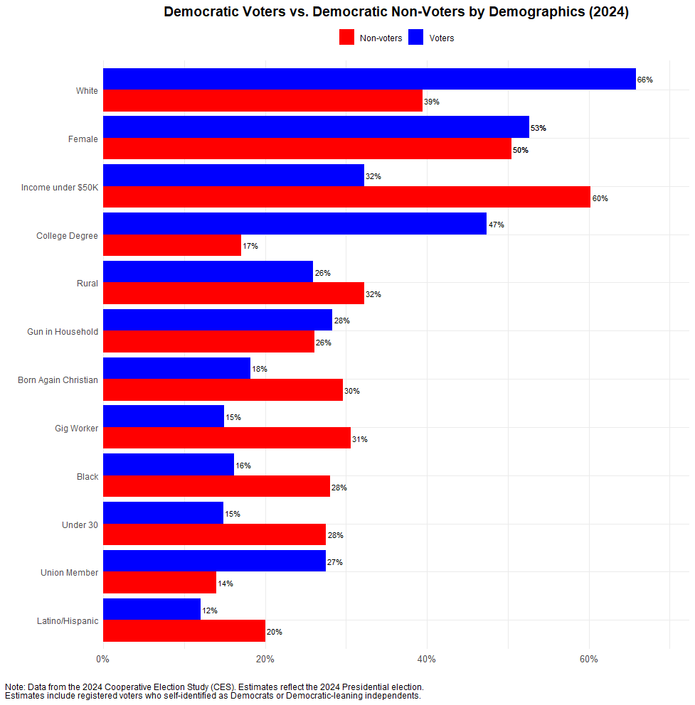 Based on the CES data, two things jump out: First, they were more likely to be non-white. Only 39 percent of Democratic nonvoters identified as white, while 28 percent identified as Black, and 20 percent as Latino. This means that, compositionally, the more conservative profile of nonvoting Democrats (compared to voting Democrats) cannot be attributed to a whiter electorate. This again cuts against progressive claims that non-white Democrats are especially moved by more liberal appeals.