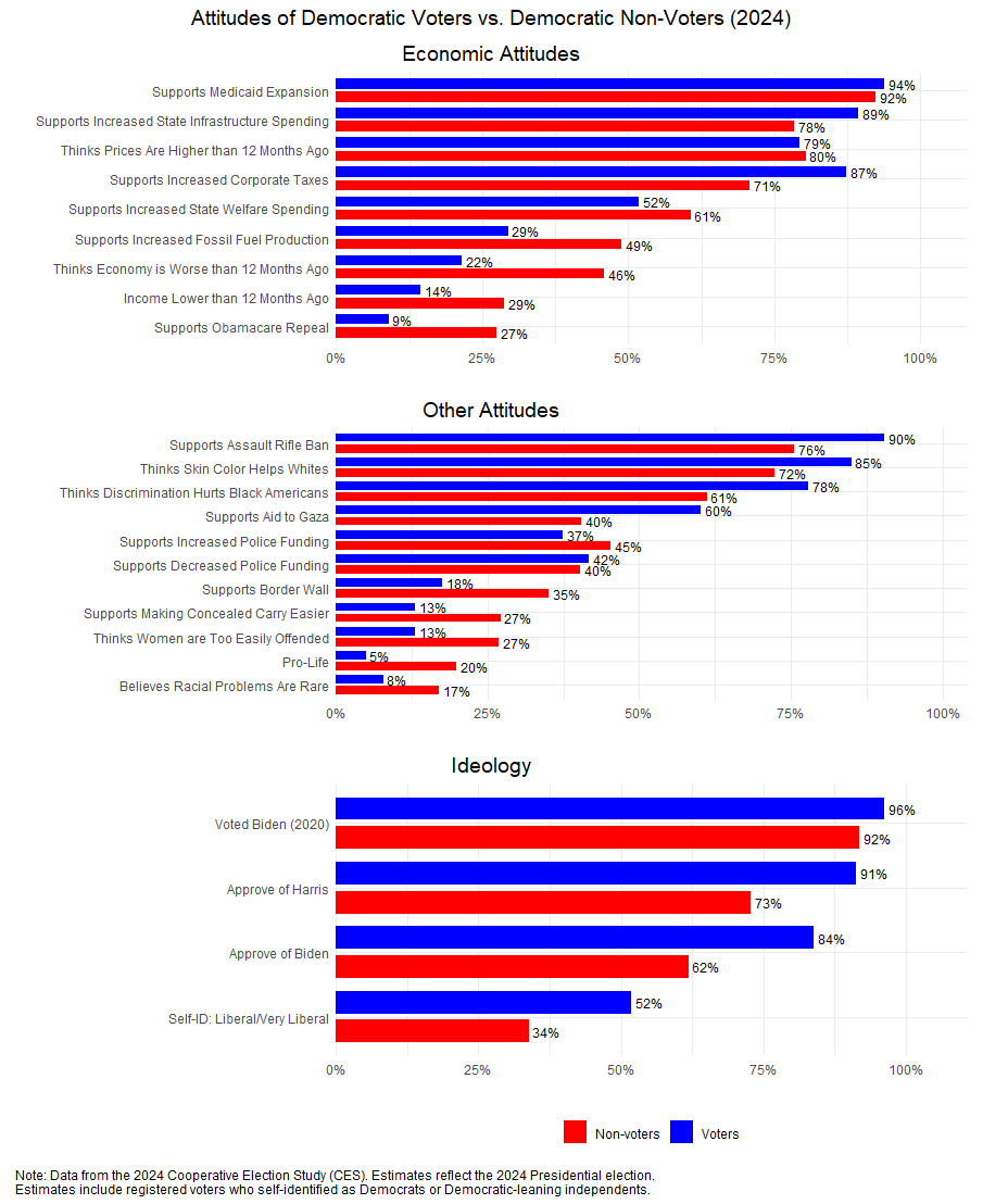The second thing to notice about the demographics of Democratic nonvoters: They were overwhelmingly working class and relatively economically precarious. Democratic nonvoters were nearly twice as likely (60 percent vs. 32 percent) to have a household income of less than $50,000 per year, they were nearly three times less likely to hold a four-year college degree (47 percent vs. 17 percent), twice as likely to be gig workers (31 percent vs. 15 percent), and only half as likely to be union members (27 percent vs. 14 percent). Further, nonvoting Democrats were more than twice as likely as voting Democrats to report feeling the economy is worse now than a year ago (46 percent vs. 22 percent) or that their incomes had recently decreased. And, perhaps not surprisingly given their economic precarity, Democratic nonvoters were substantially more likely than voters to support increased state welfare spending (61 percent vs. 52 percent). These class characteristics show nonvoting Democrats’ economic attitudes in a clearer light. In fact, if Democrats could have done anything to reach more of their base in 2024, then, it seems most likely that they could’ve done so by offering a compelling economic narrative about how they were going to improve the well-being of working Americans.